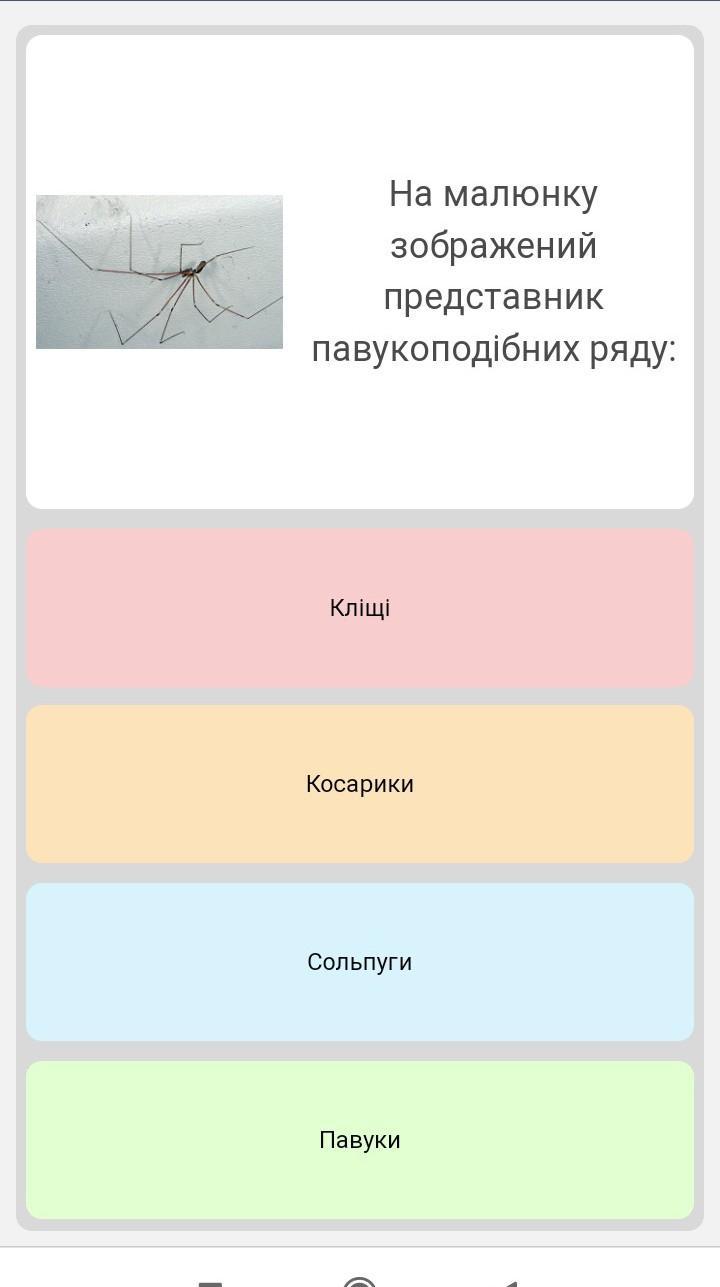 На малюнку зображений представник павукоподібних ряду: Кліщі Косарики Сольпуги Павуки