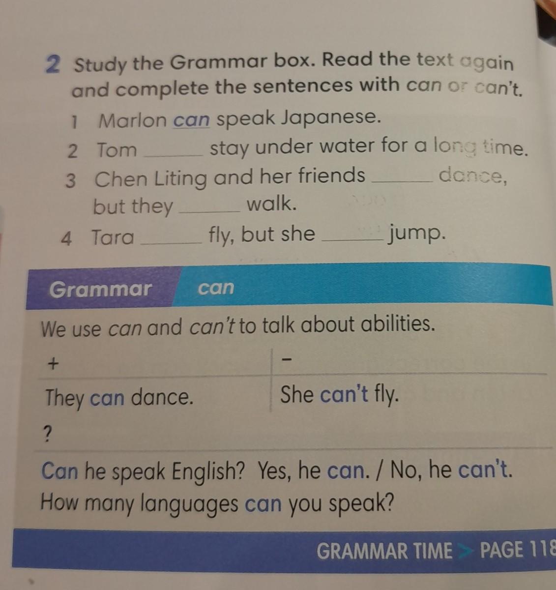 Study the Grammar box. Read the text again and complete the sentences with can or can't.