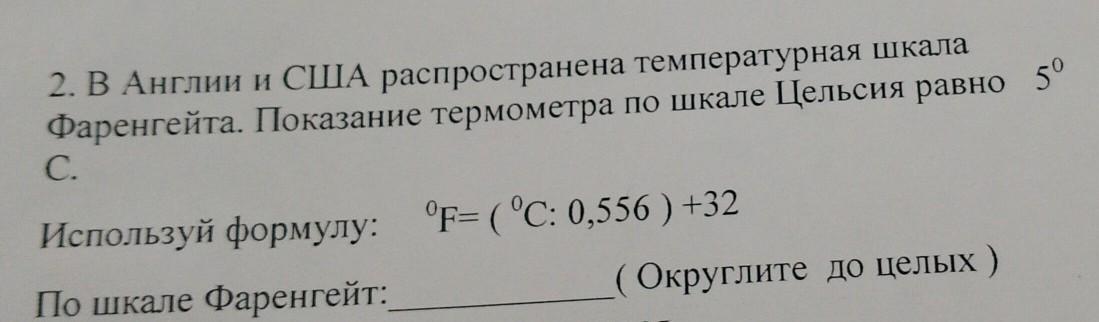 2. В Англии и США распространена температурная шкала Фаренгейта. Показание термометра по шкале Цельсия равно 50 С. Используй формулу : °F = ( °C: 0,556 ) +32 По шкале Фаренгейт: (Округлите до целых