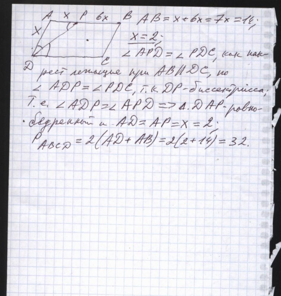 В параллелограмме ABCD биссектриса угла D пересекает сторону AB в точке P. Отрезок AP меньше отрезка PB в 5 раз. Найдите периметр параллелограмма, если AB = 12 см. ДАНО , решение , чертеж, ответ
