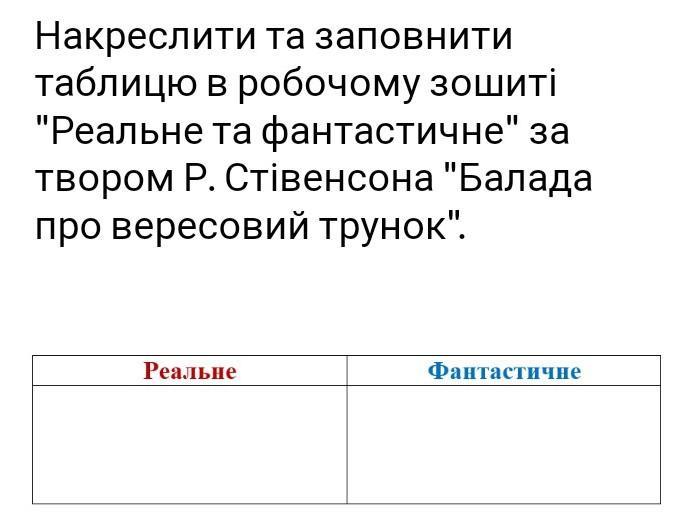 Накреслити та заповнити таблицю в робочому зошиті "Реальне та фантастичне" за твором Р. Стівенсона "Балада про вересовий трунок". Реальне Фантастичне