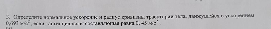 Определите нормальное ускорение и радиус кривизны траектории тела, движущейся с ускорением 0,693 м/с², если тангенциальная составляющая равна 0, 45 м/с².