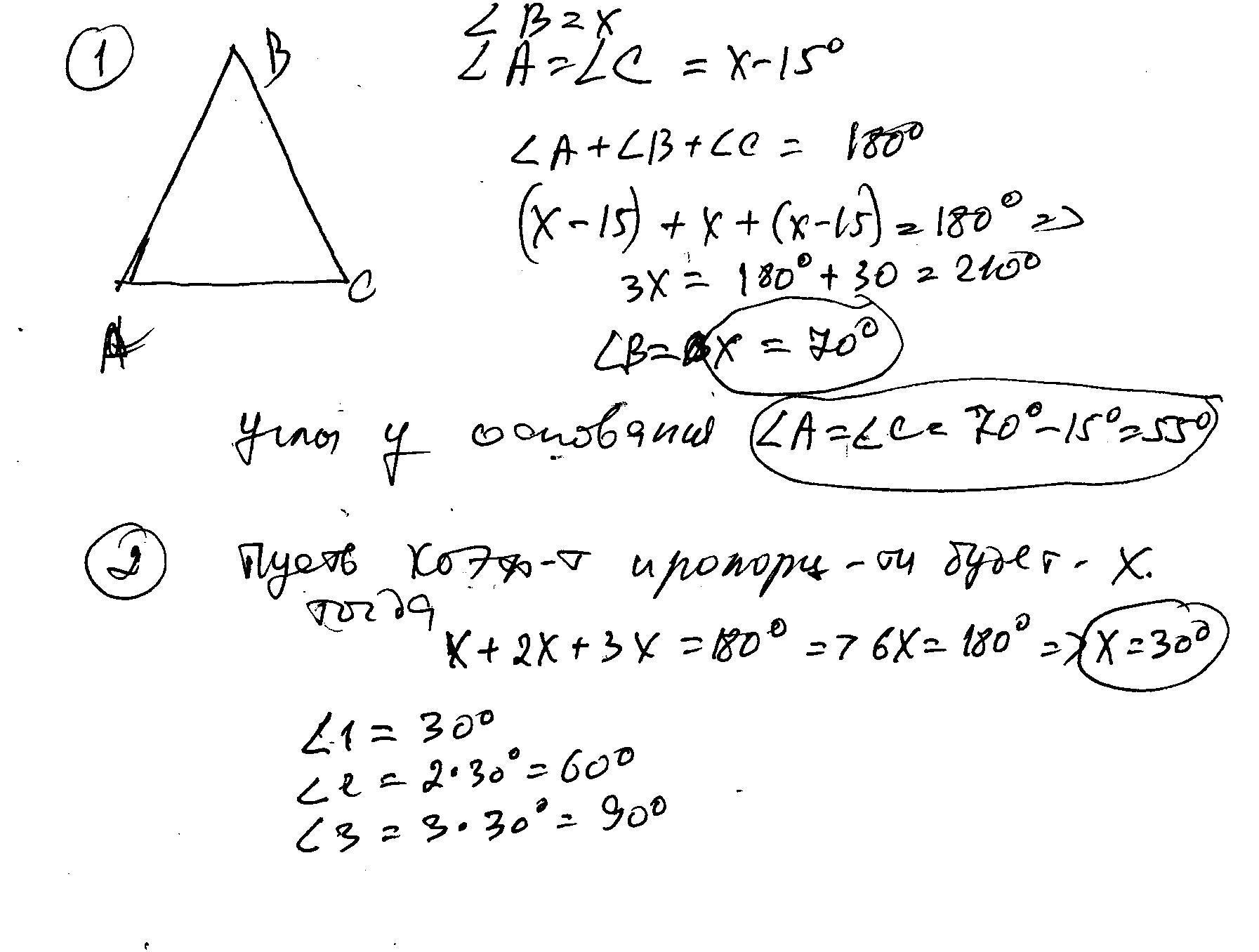 1)В равнобедренном треугольнике угол при основании на 15 градусов меньше,чем при вершине,противоположной основанию.Найдите углы этого треугольника.