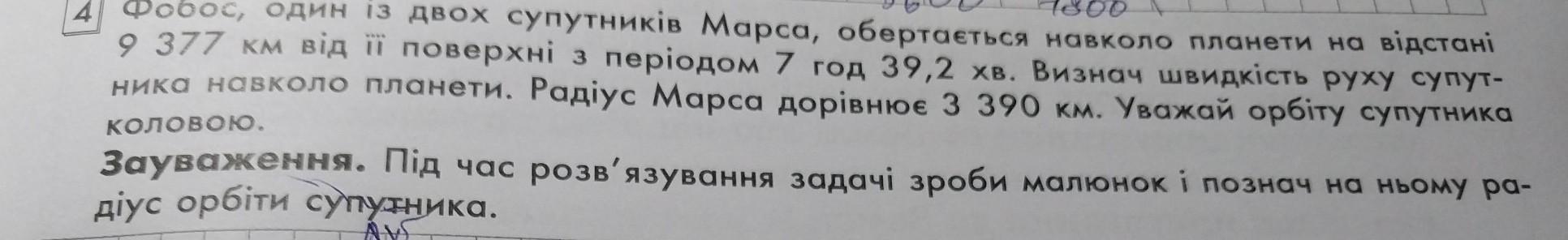Фобос, один із двох супутників Марса, обертається навколо планети на відсто 9 377 км від її поверхні з періодом 7 год 39,2 хв. Визнач швидкість руху суп ника навколо планети. Радіус Марса дорівнює 3 390 км. Уважай орбіту супутн коловою. Зауваження. Під час розв'язування задачi зроби малюнок і познач на ньому діус орбіти супутника.