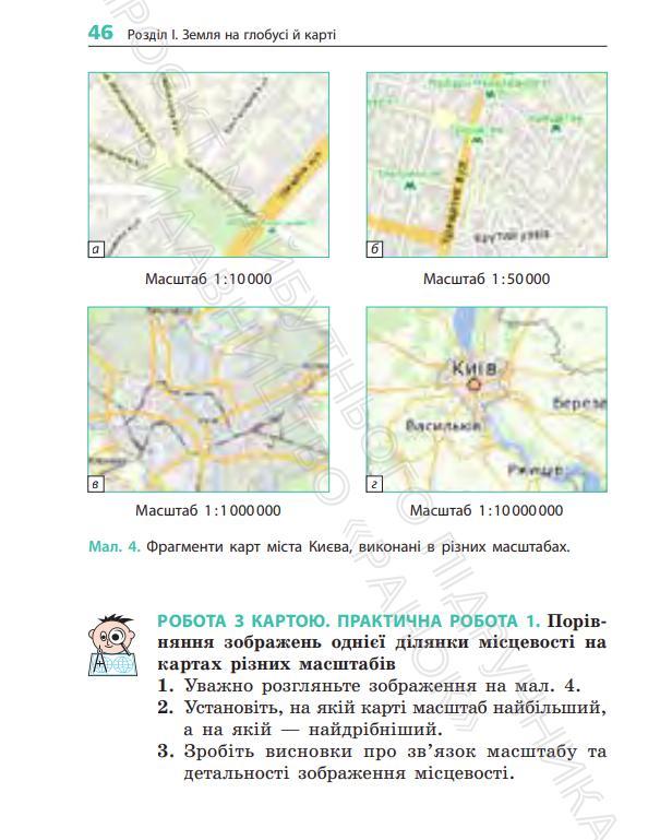РОБОТА З КАРТОЮ. ПРАКТИЧНА РОБОТА. Порівнян- ня зображень однієї ділянки місцевості на картах різних масштабів. 1. Розгляньте зображення на мал. 4. 2. Установіть, на якій карті масштаб найбільший, а на якій - найдрібніший. 3. Зробіть висновки про зв'язок масштабу та детальності зображення місцевості.