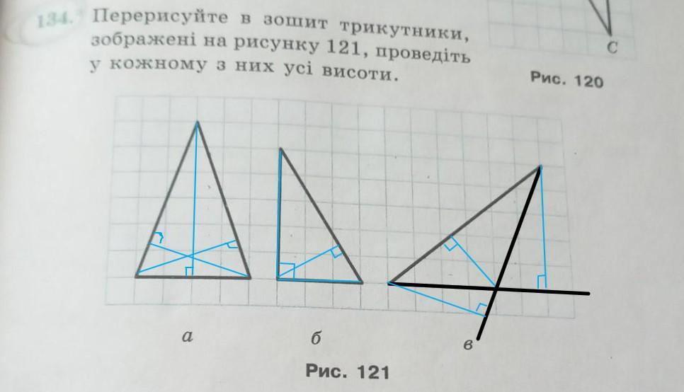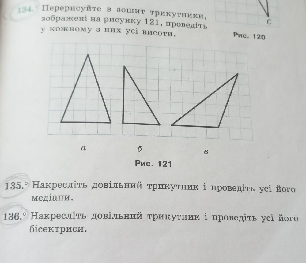 Там на малюнках все показано. Висота - це перпендикуляр, медіана ділить сторону навпіл, бісектриса ділить кут навпіл. Головне - перемалюй правильно.