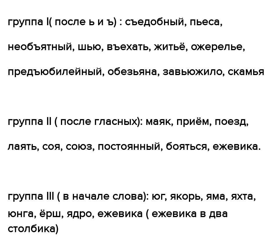 группа I( после ь и ъ) : съедобный, пьеса, необъятный, шью, въехать, житьё, ожерелье, предъюбилейный, обезьяна, завьюжило, скамья