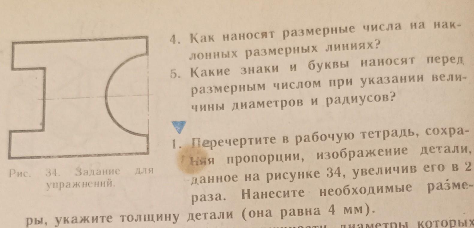 1. Перечертите в рабочую тетрадь, сохраняя пропорции, изображение детали, данное на рисунке 34, увеличив его в 2 раза. Нанесите необходимые разме- ры, укажите толщину детали (она равна 4 мм).