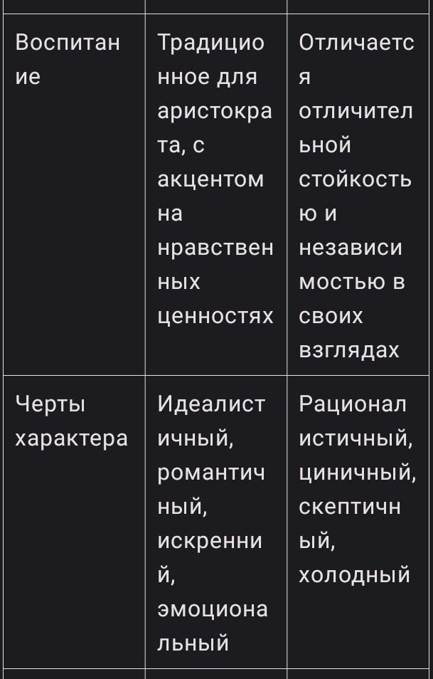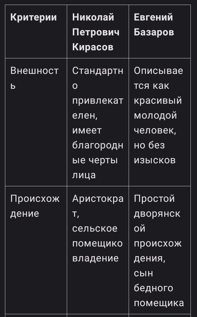 Сравните в таблице: Николая Петровича Кирасова и Евгения Базарова из Романа Отцы и дети.