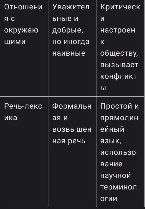 Критерии: Внешность, происхождение, воспитание, черты характера, образование, общественно политические взгляды, отношения с окружающими, речь-лексика. Огромное спасибо за ранее