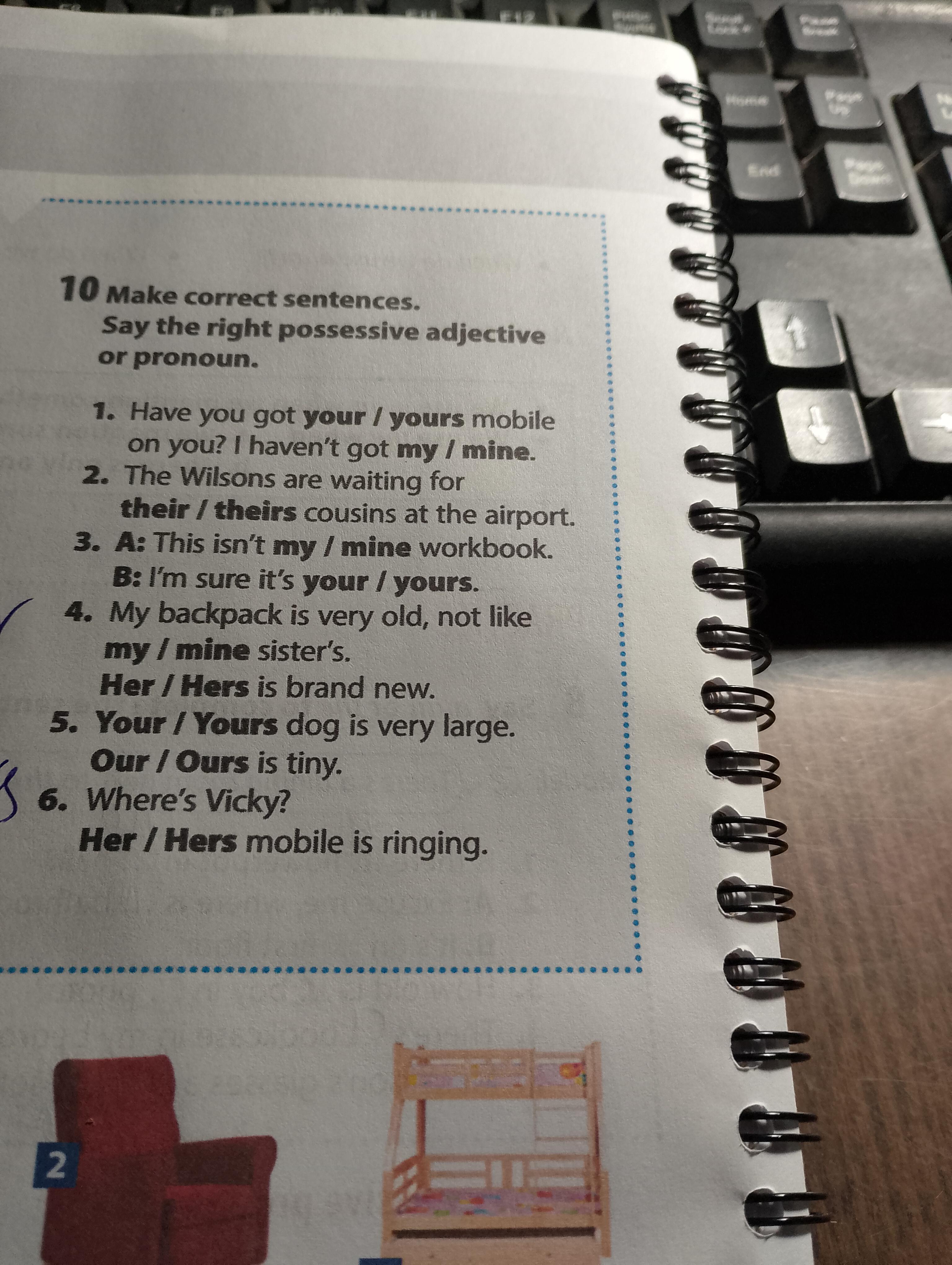 Ответ:1 your 2theirs3mine 4my5yours our 6 hers