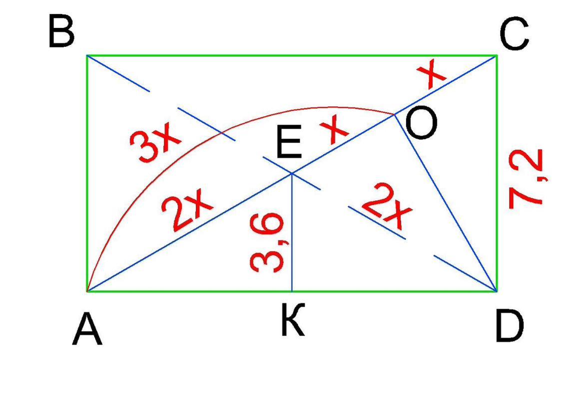 Побудуємо прямокутник ABCD, та проведемо в ньому діагоналі АС і BD, а також висоту DO до діагоналі АС і висоту EK із точки перетину діагоналей до більшої сторони AD.