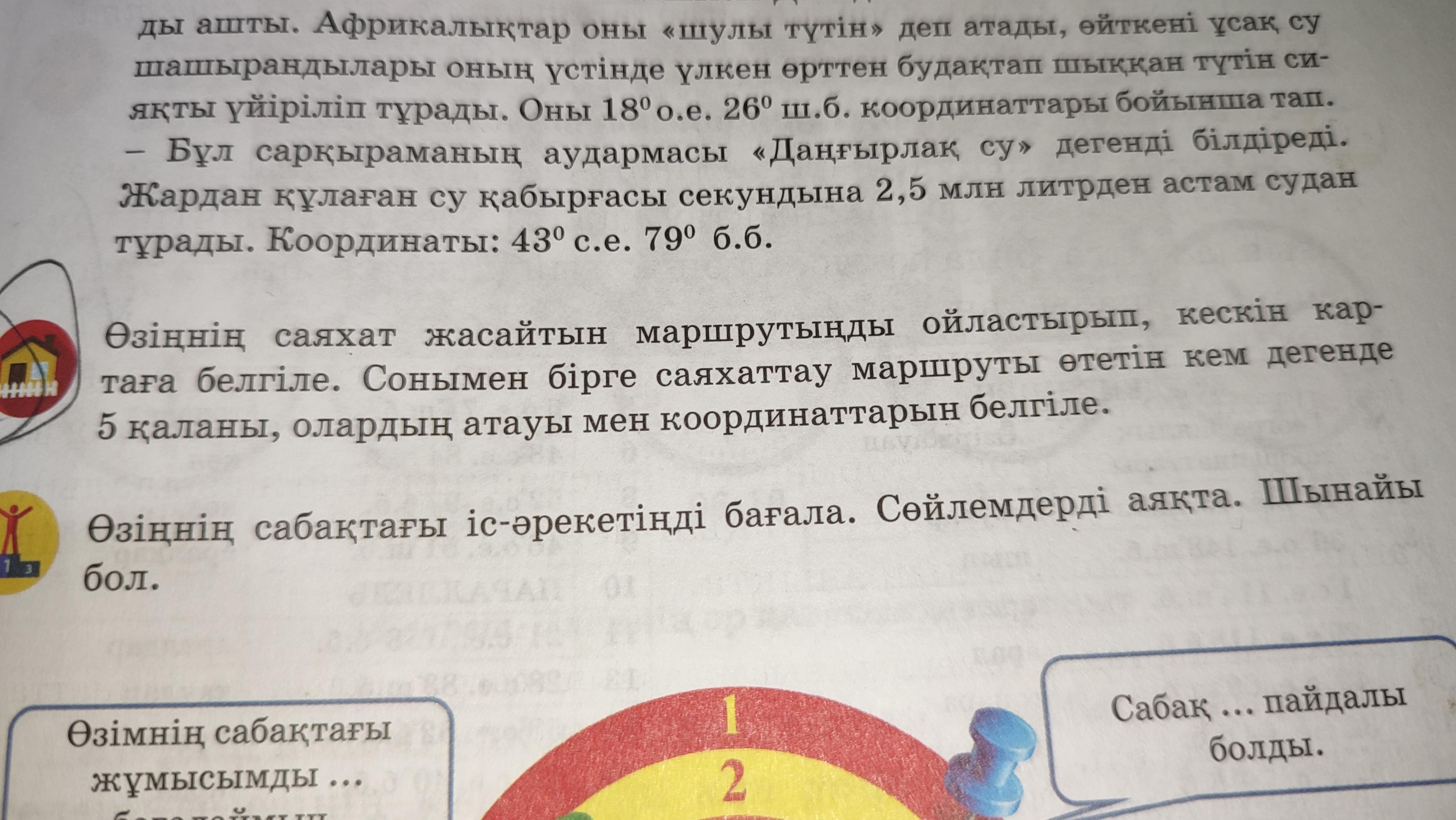 Өзіңнің саяхат жасайтын маршрутыңды ойластырып, кескін картаға белгіле. Сонымен бірге саяхаттау маршруты өтетін кем дегенде 5 қаланы, олардың атауы мен координаттарын белгіле.
