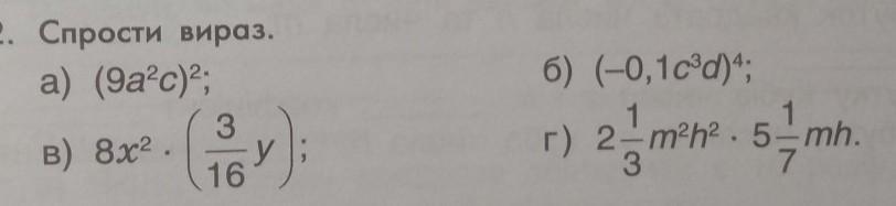 2. Спрости вираз. a) (9a²c)²; B) 8x². 3 (y): 16 6) (-0,1c³d)4; 1 r) 2-/m²h². 5 mh. 3