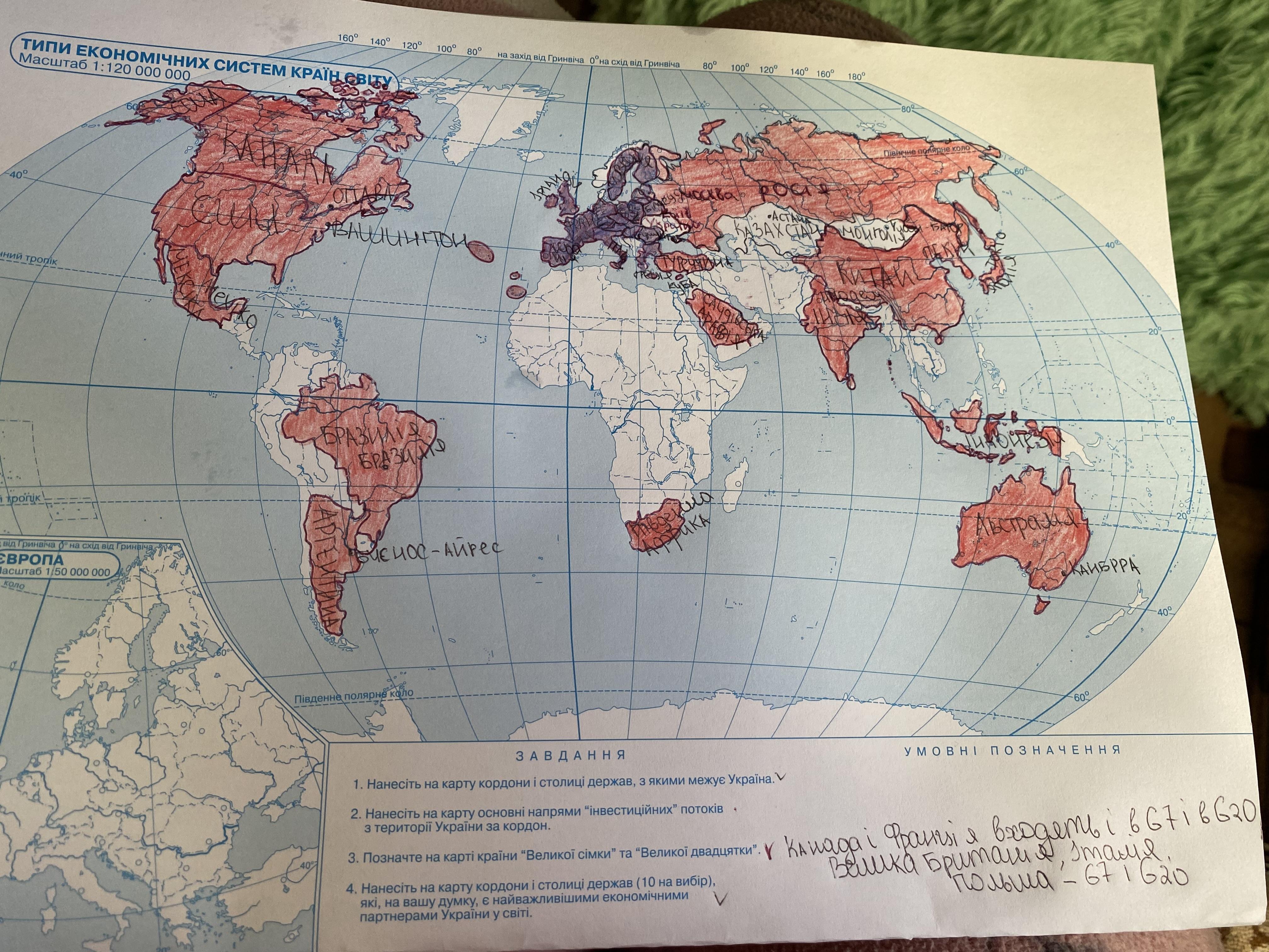 4. Нанесіть на карту кордони і столиці держав(10 на вибір) які на вашу думку, є найважливішими економічними партнерами України у світі.