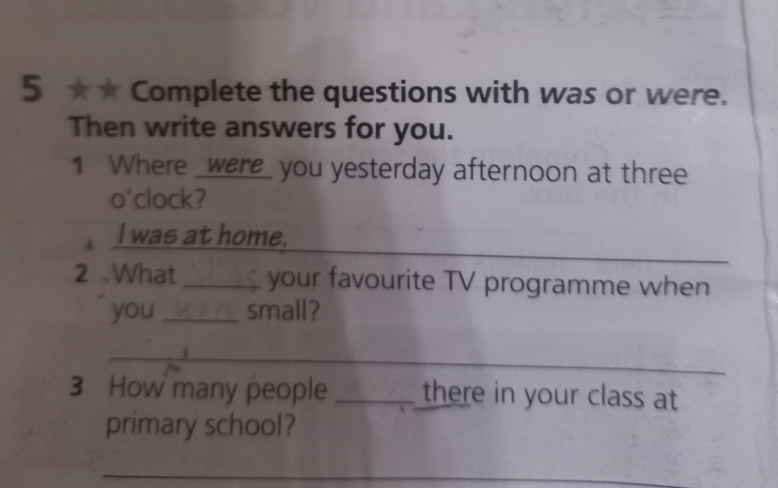 ★ 5 Complete the questions with was or were. Then write answers for you. 1 Where were you yesterday afternoon at three o'clock? I was at home. 2 What you your favourite TV programme when small? 3 How many people primary school? 4 How old there in your class at you in 2011?