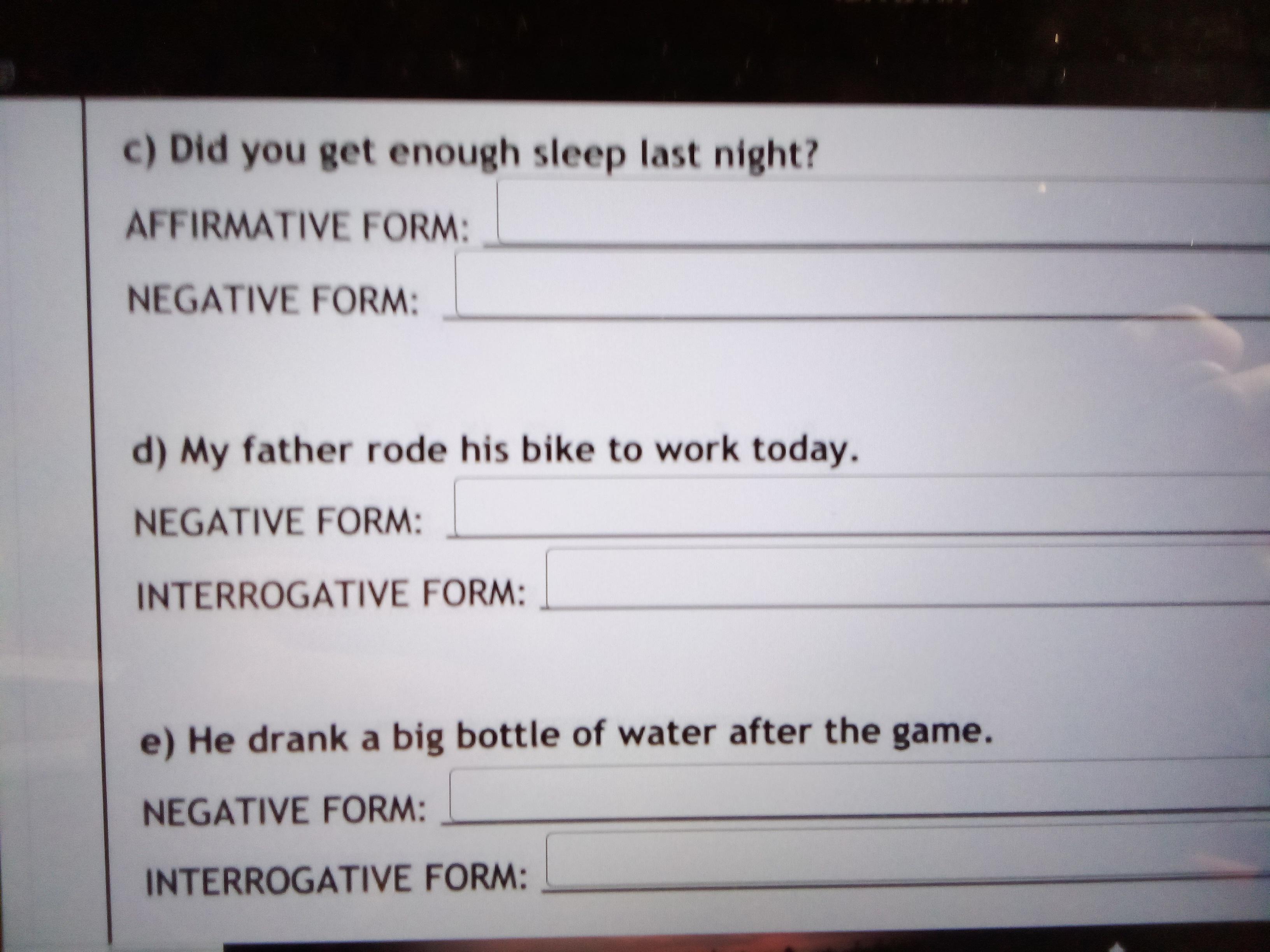 d: Negative: my father doesn't like to ride his bike to work, but he can't drive his car because it's broken. Interrogative: father, why did you ride your bike to work today?