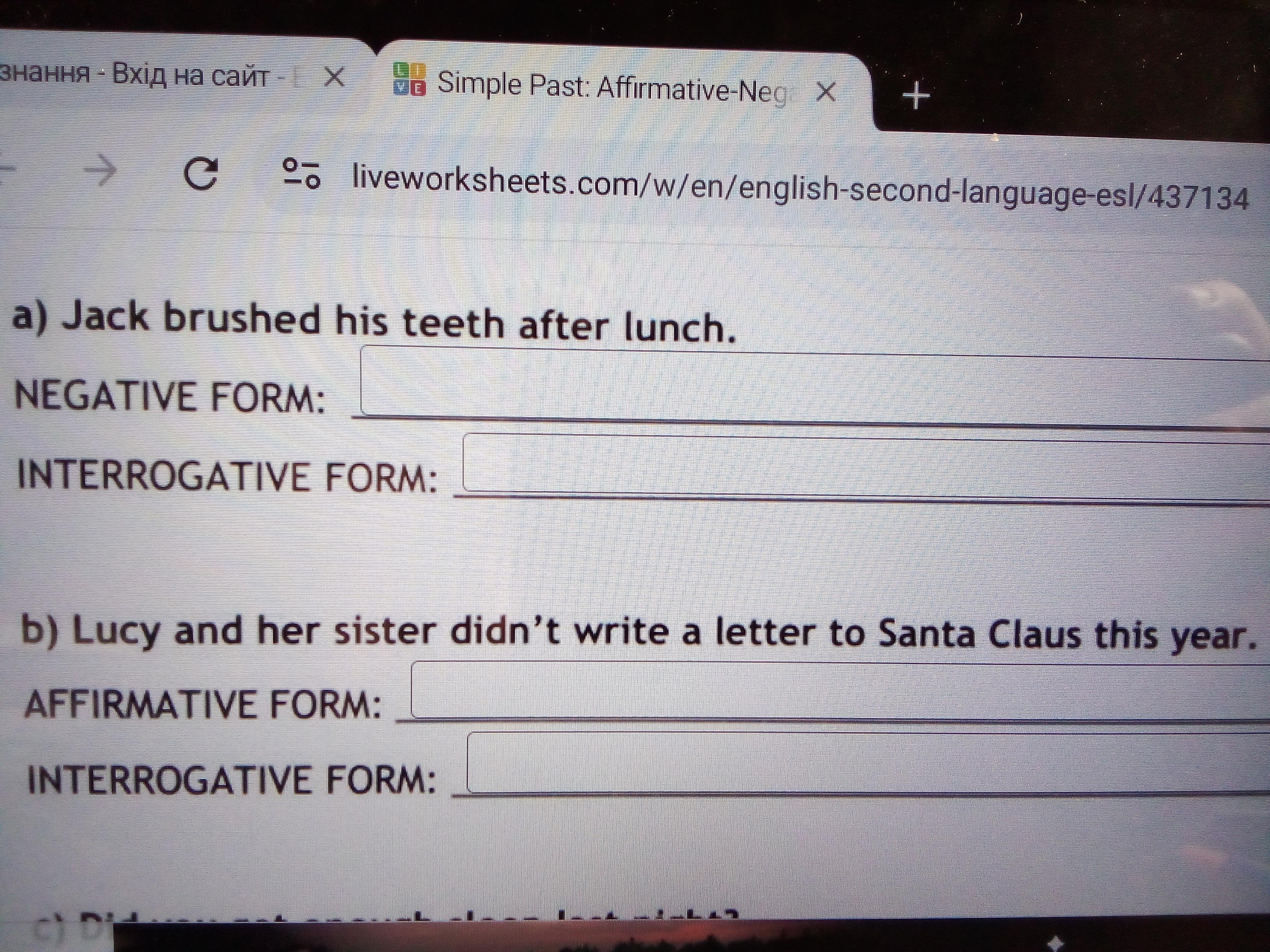 Відповідь: a) Negative: form Jack doesn't like brushing his teeth after lunch. Interrogative: Jack, why don't you brush your teeth after lunch?