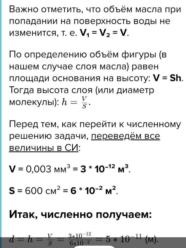 Крапелька олії, що має об'єм 12мм3, розпливається по поверхні води плямою, яка має площу 600000см². Визначте діаметр молекули, якщо допустити, що він дорівнює товщині плями.