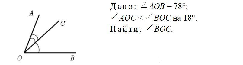Оскільки кут AOC < кут ВОС на 18 градусів, то кут AOC = 78 - 18 = 60 градусів.
