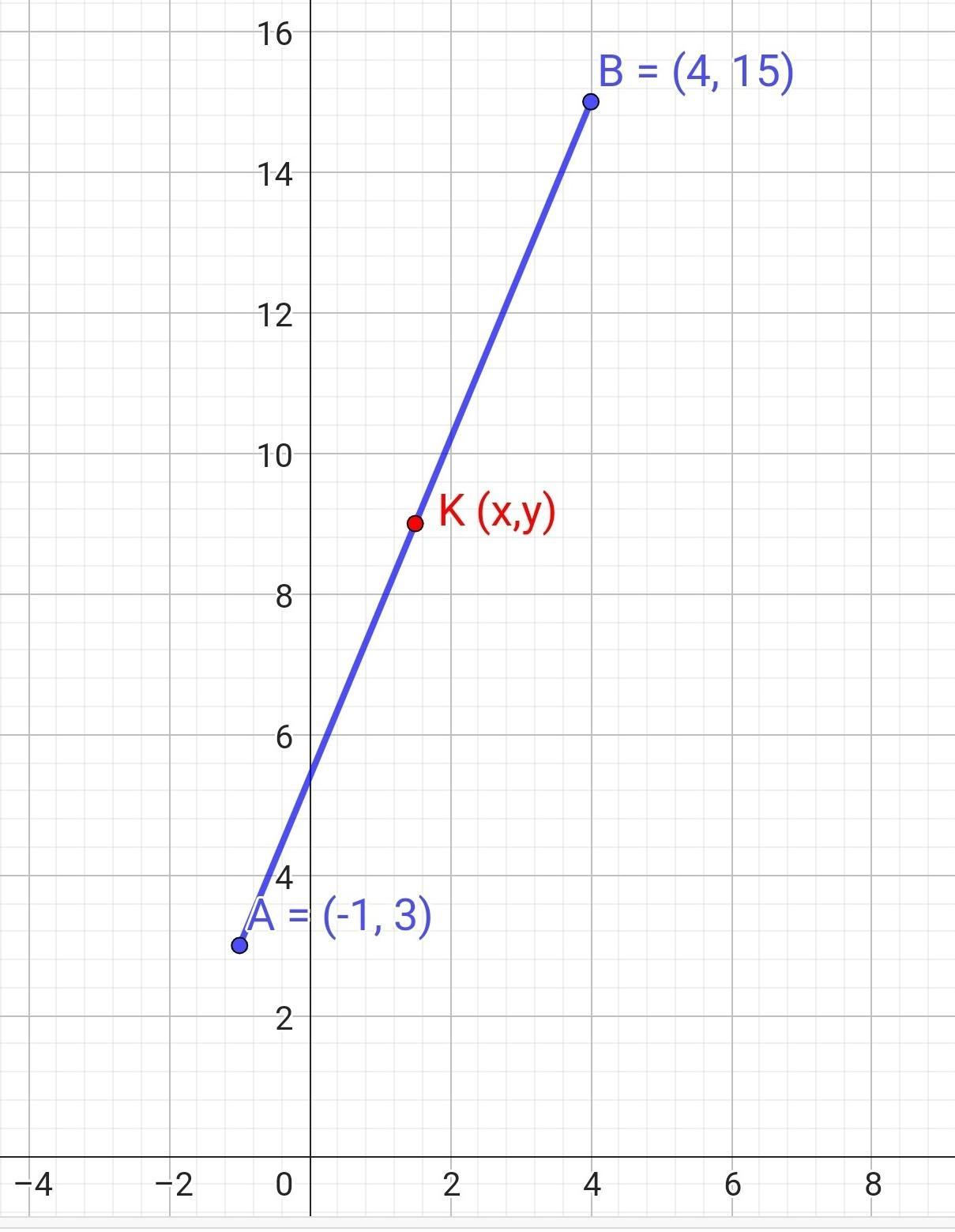Точка К - середина відрізка з кінцями в точках А(-1; 3) і В(4; 15).