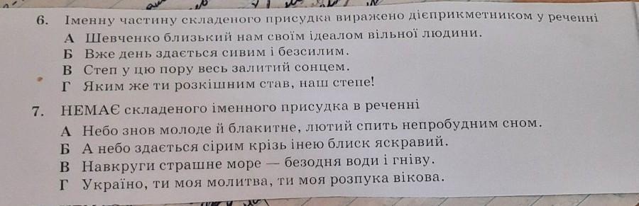 6. Іменну частину складеного присудка виражено дієприкметником у реченні А Шевченко близький нам своïм ідеалом вiльної людини. P Б Вже день здається сивим і безсилим. в Степ у цю пору весь залитий сонцем. r Яким же ти розкішним став, наш степе!