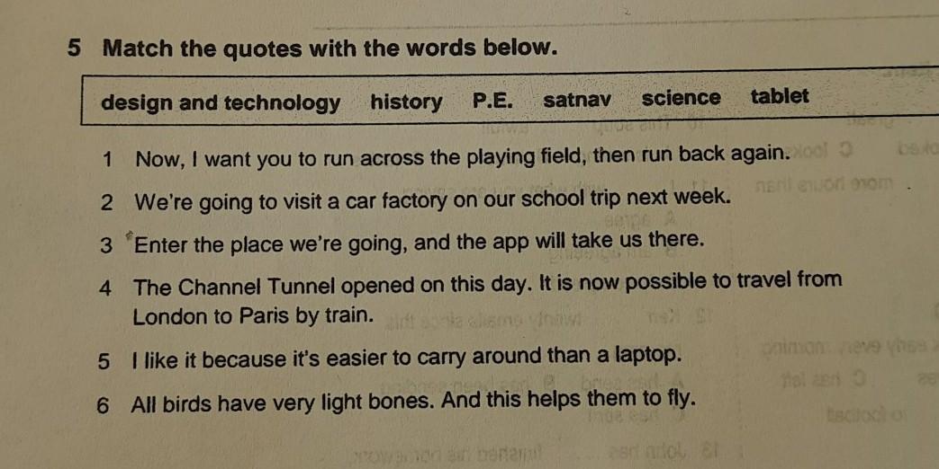 5. Match the quotes with the words below. design and technology history P.E. satnav science tablet 1 Now, I want you to run across the playing field, then run back again. 2 We're going to visit a car factory on our school trip next week. 3 Enter the place we're going, and the app will take us there. 4 The Channel Tunnel opened on this day. It is now possible to travel from Windh London to Paris by train. nia clising inawi 5 I like it because it's easier to carry around than a laptop. 6 All birds have very light bones. And this helps them to fly. Dhimon neve yhse tadlock of
