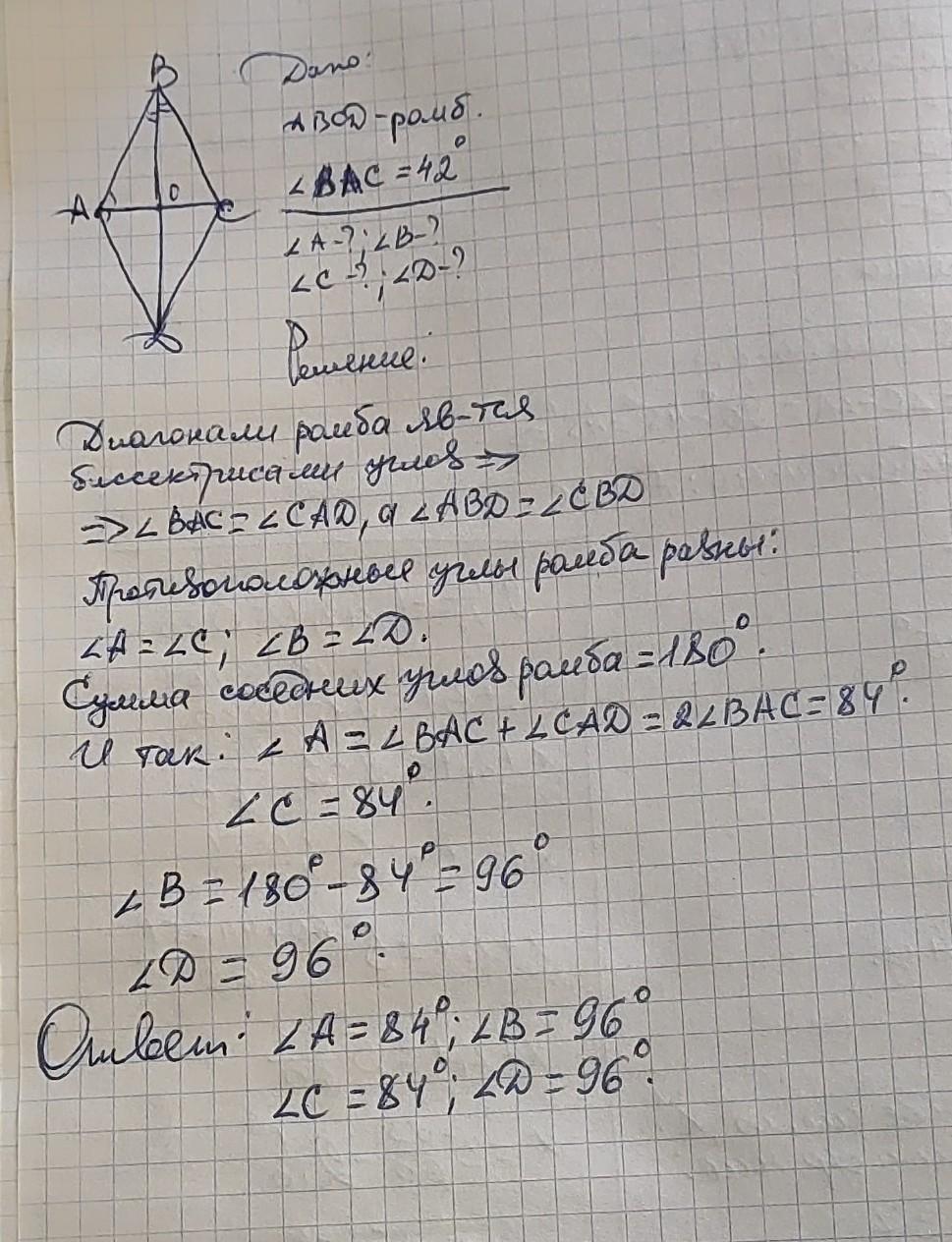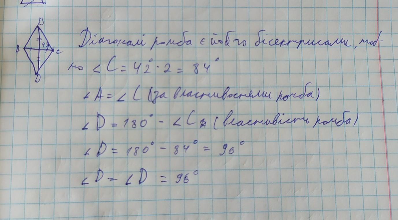 кут 42°. Знайдіть кути ромба СРОЧНО і на українскій пж