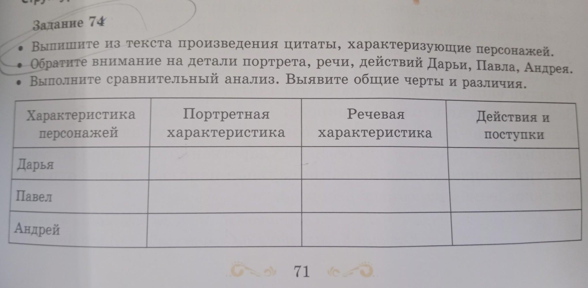 Задание 74 . Выпишите из текста произведения цитаты, характеризующие персонажей. • Обратите внимание на детали портрета, речи, действий Дарьи, Павла, Андрея. • Выполните сравнительный анализ. Выявите общие черты и различия. Характеристика персонажей Дарья Павел Андрей Портретная характеристика Речевая характеристика Действия и поступки