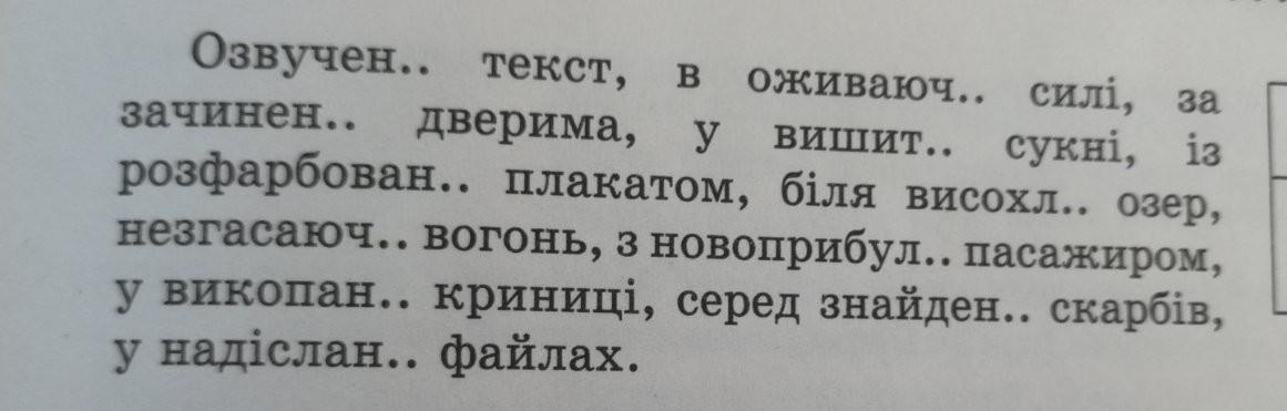 Спишіть словосполучення, узгоджуючи за допомогою відповідних закінчень діє прикметники з іменниками в роді, числі й відмінку. Підкресліть букви и, і в закінченнях Дієприкметників.