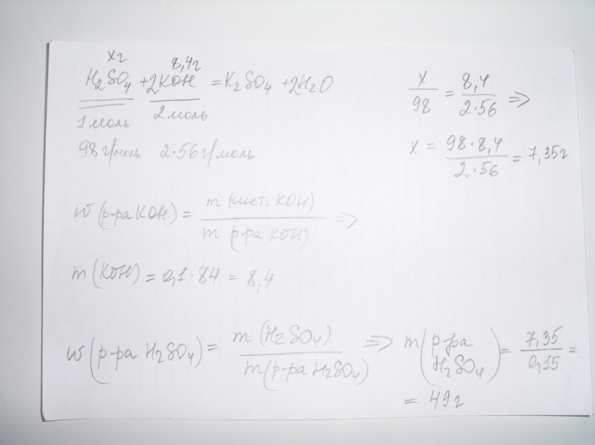 вычислите массу раствора серной кислоты с массовой долей вещества 15%,которая необходима для полной нейтрализации раствора гидроксида калия массой 84 г с массовой долей щелочи 0.1. плииз очень нужнооо умоляю!!!!!!