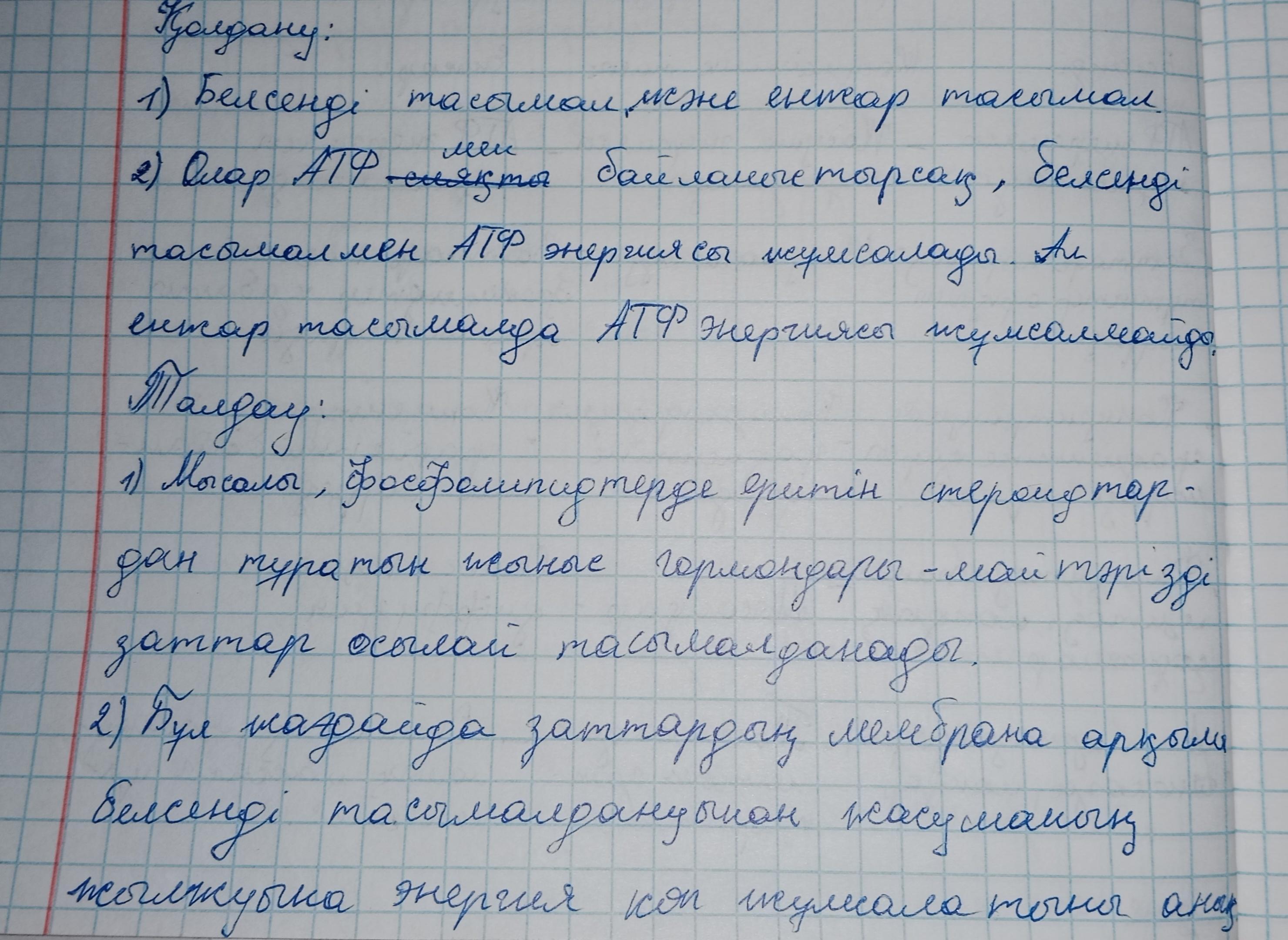 1. Белсенді тасымал енжар тасымалды алмастыра алмайтынын және керiсiнше болмайтынын мысалдар келтiрiп дәлелдендер. 2. Мембрана арқылы иондар тасымалына жұмсалатын энергия мөлшері мен жасушалардын физиологиялық ерекшеліктері арасындағы тәуелдiлiктi аныктандар және талдандар.