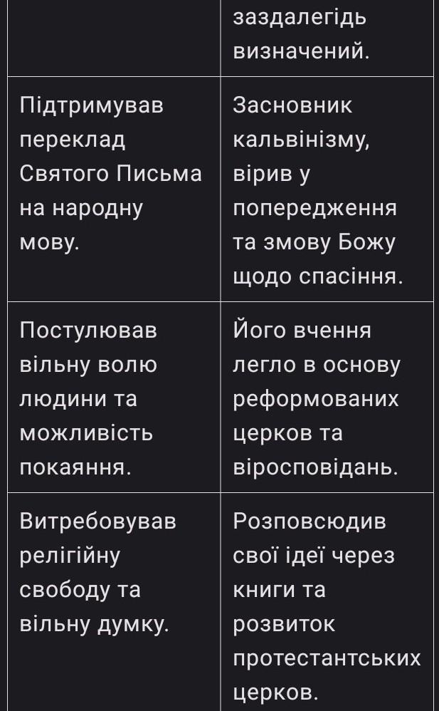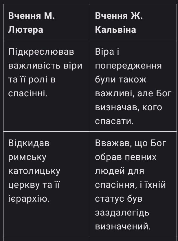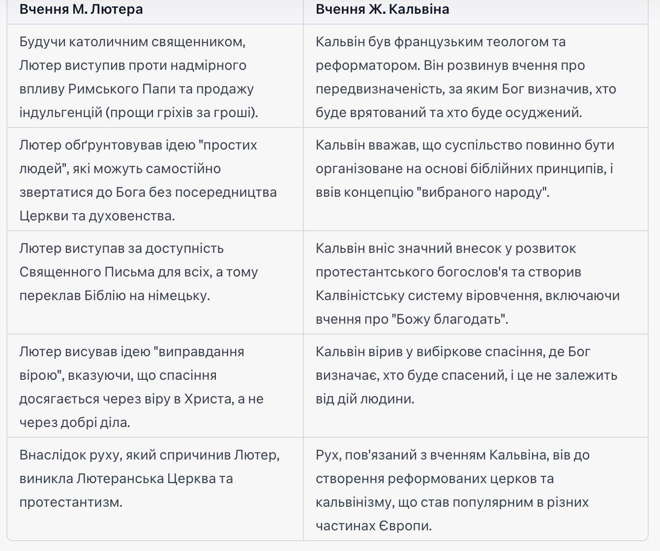 Вчення М. ЛютераВчення Ж. КальвінаБудучи католичним священником, Лютер виступив проти надмірного впливу Римського Папи та продажу індульгенцій (прощи гріхів за гроші).Кальвін був французьким теологом та реформатором. Він розвинув вчення про передвизначеність, за яким Бог визначив, хто буде врятований та хто буде осуджений.Лютер обґрунтовував ідею "простих людей", які можуть самостійно звертатися до Бога без посередництва Церкви та духовенства.Кальвін вважав, що суспільство повинно бути організоване на основі біблійних принципів, і ввів концепцію "вибраного народу".Лютер виступав за доступність Священного Письма для всіх, а тому переклав Біблію на німецьку.Кальвін вніс значний внесок у розвиток протестантського богослов'я та створив Калвіністську систему віровчення, включаючи вчення про "Божу благодать".Лютер висував ідею "виправдання вірою", вказуючи, що спасіння досягається через віру в Христа, а не через добрі діла.Кальвін вірив у вибіркове спасіння, де Бог визначає, хто буде спасений, і це не залежить від дій людини.Внаслідок руху, який спричинив Лютер, виникла Лютеранська Церква та протестантизм.Рух, пов'язаний з вченням Кальвіна, вів до створення реформованих церков та кальвінізму, що став популярним в різних частинах Європи.