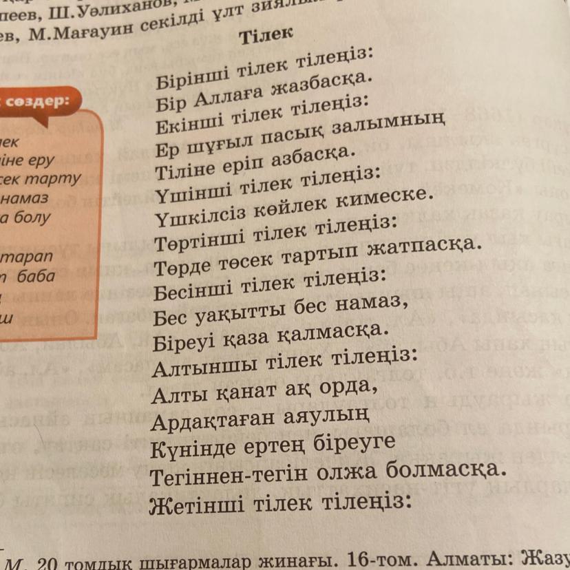Бірінші тілек - аллаға серік қоспау туралы. Екінші тілек - зұлым адамның айтқанына еріп кетпеу. Төртінші тілек - ауырып жатып калмауды тыленыныз. Бесінші тілек - 5 уақыт намазынды қаза кылдырмауды. Алтыншы тілекте вроде, қызын немесе ұлың быреуге бағынышты болып кетесін деп