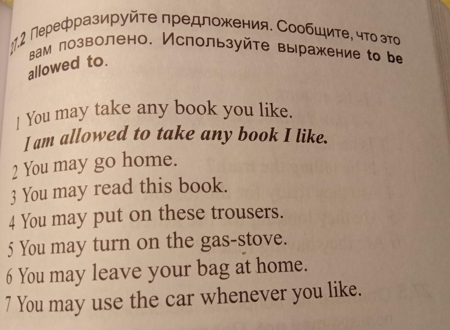 Используйте выражение to be allowed to. 1 You may take any book you like. I am allowed to take any book I like. 2 You may go home. 3 You may read this book. 4 You may put on these trousers. 5 You may turn on the gas-stove. 6 You may leave your bag at home. 7 You may use the car whenever you like.