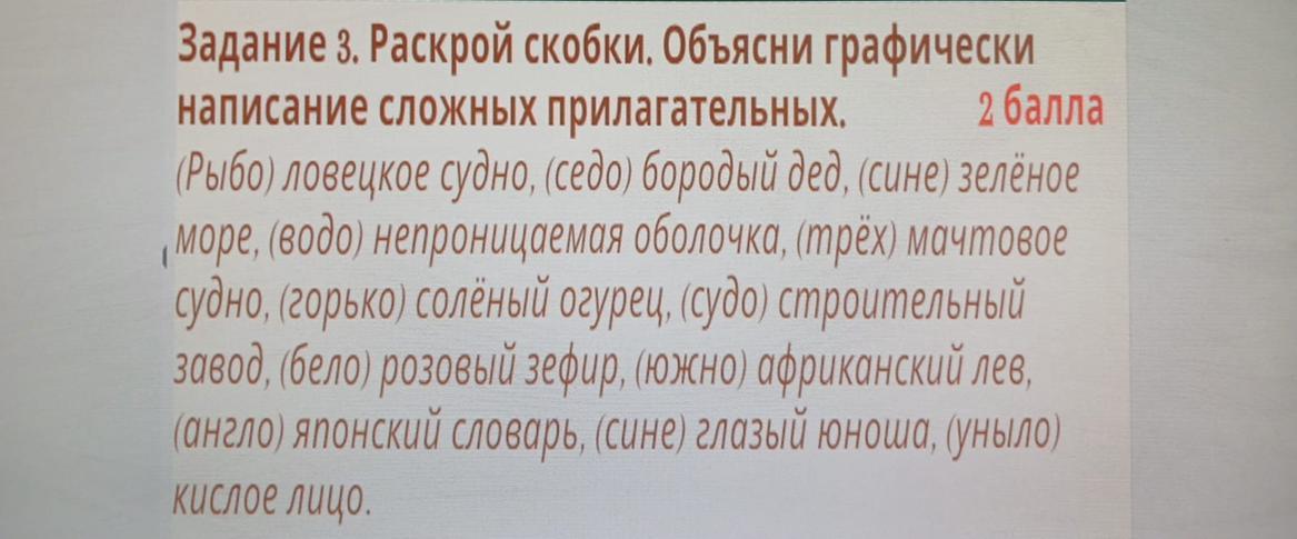 Ответ: Рыбо-Ловецкое судно, бородый дед, сине-зеленое море, водо-непроницаемая оболочка, трех-мачтовое судно, соленый огурец, строительный завод бело-розовый зефир, южно-африканский лев, японский словарь, сине-глазый юноша, кислое лицо.