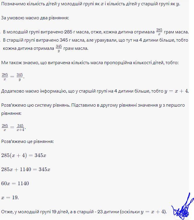 З розрахунку однакової норми масла на 1 дитину на сніданок дітяммолодшої групи дитячого садка видали 285 г вершкового масла, а дітям старшої групи- 345 г.До того ж урахували, що в старшій групі на 4 дитини більше. Скільки дітей у молодшій і старшій групах окремо?