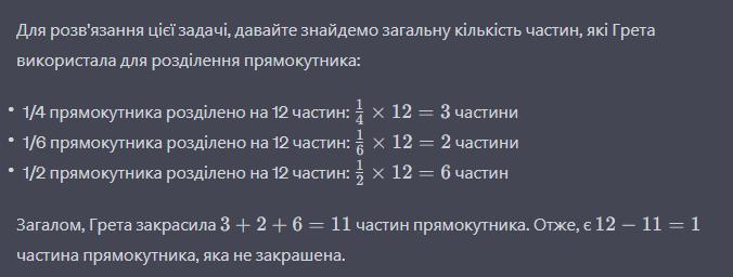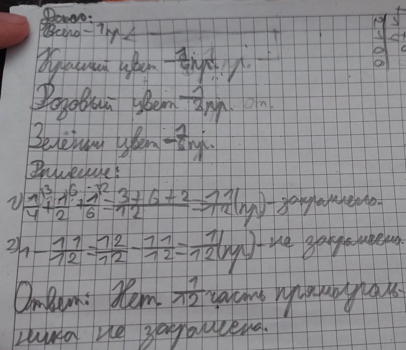 Грета разделила прямоугольник на 12 равных частей.С начала она раскрасила 1/4 прямоугольника в красный цвет,затем ещё 1/6 прямоугольника в розовый цвет. А чуть позже 1/2 прямоугольника в зелёный цвет.Весь ли прямоугольник закрашен? Если нет,то сколько прямоугольника не закрашено?