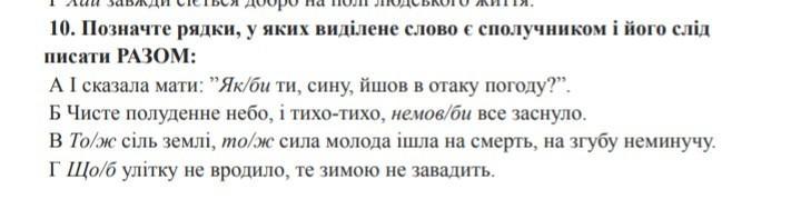 10. Позначте рядки, у яких виділене слово є сполучником і його слід писати РАЗОМ: А I сказала мати: "Як/би ти, сину, йшов в отаку погоду?". Б Чисте полуденне небо, і тихо-тихо, немов/би все заснуло. в То/ж сiль землi, mо/ж сила молода ішла на смерть, на згубу неминучу. Г Що/б улітку не вродило, те зимою не завадить.