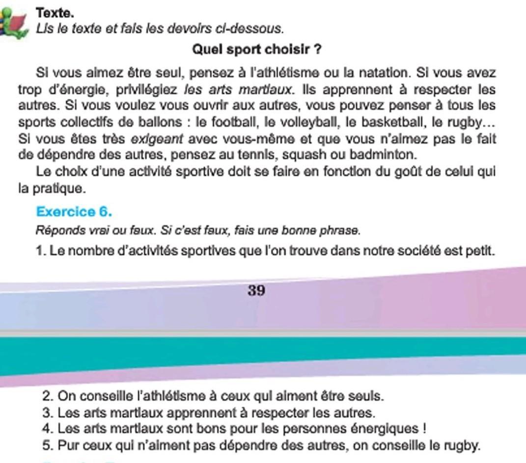 1. Le nombre d'activités sportives que l'on trouve dans notre société est petit. 2. On conseille l'athlétisme à ceux qui aiment être seuls.