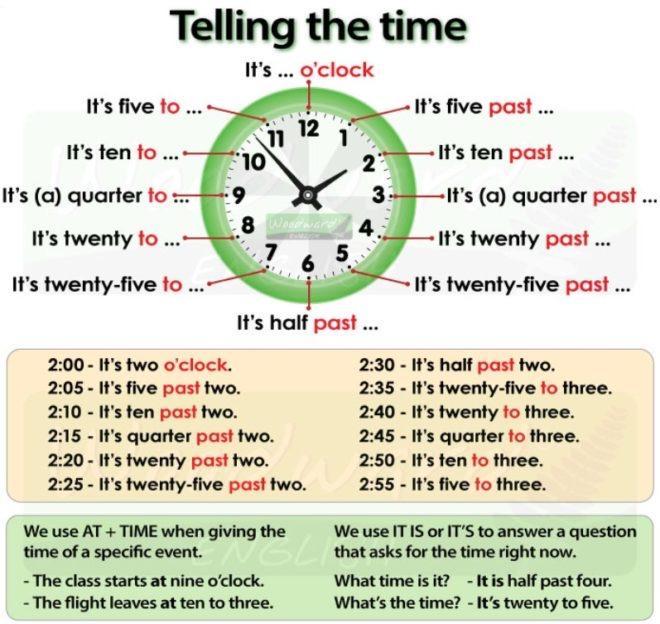 Прикрепляю таблицу на всякий случай для лучшего понимания) Правило на самом деле понятное: когда минутная стрелка показывает на цифры 1, 2, 3, 4, 5, то мы говорим сколько минут прошло после какого-то часа. Например, если время 14:10, то они скажут, что прошло 10 после двух. То есть 10 минут назад было ровно два часа. It's ten past two.