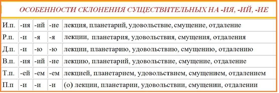 Существительные, заканчивающиеся в начальной форме на -ия (1 скл.) -ие, -ий (2 скл.), имеют особенности склонения. См. таблицу в приложении.