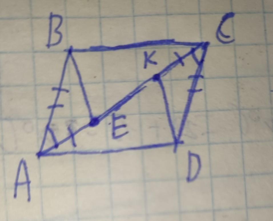 Трикутники ABE і CKD рівні за першою ознакою, тому, що кути внутрішні різносторонні при паралельних прямих, сторони AB і CD рівні за властивістю, а AE=CK за умовою, отже з рівності трикутників випливає, що BE=DK, що й треба було довести
