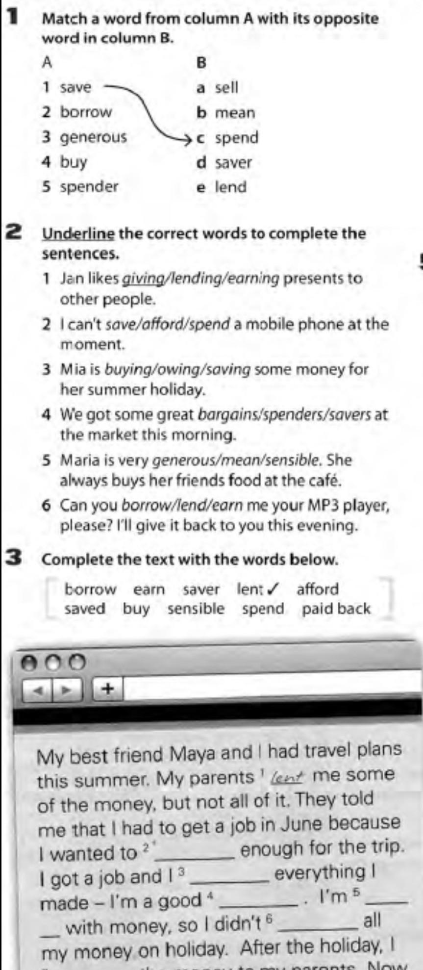 My best friend Maya and I had travel plans this summer. My parents 1) lent me some of the money, but not all of it. They told me that I had to get a job in June because I wanted to 2) earn enough for the trip. I got a job and I 3) saved everything I made - I'm a good 4) saver. I'm 5) sensible with money, so I didn't 6) spend all my money on holiday. After the holiday, I 7) paid back the money to my parents. Now I really want to 8) buy a motorbike. I can't 9) afford it, so I'm going to 10) borrow some more money but I'm going to work on Saturdays to pay it back.