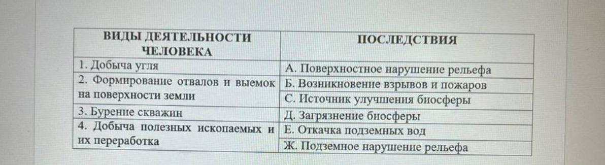 Установите соответствие между деятельностью человека при добыче переработке полезных ископаемых и их последствиями. Два ответа являются лишними.