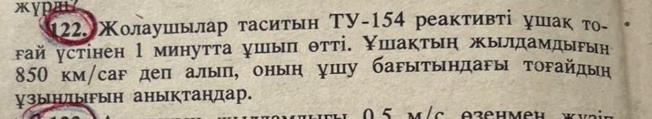122. Жолаушылар таситын ТУ-154 реактивті ұшақ то- ғай үстінен 1 минутта ұшып өтті. Ұшақтың жылдамдығын 850 км/сағ деп алып, оның ұшу бағытындағы тоғайдын ұзындығын анықтаңдар.