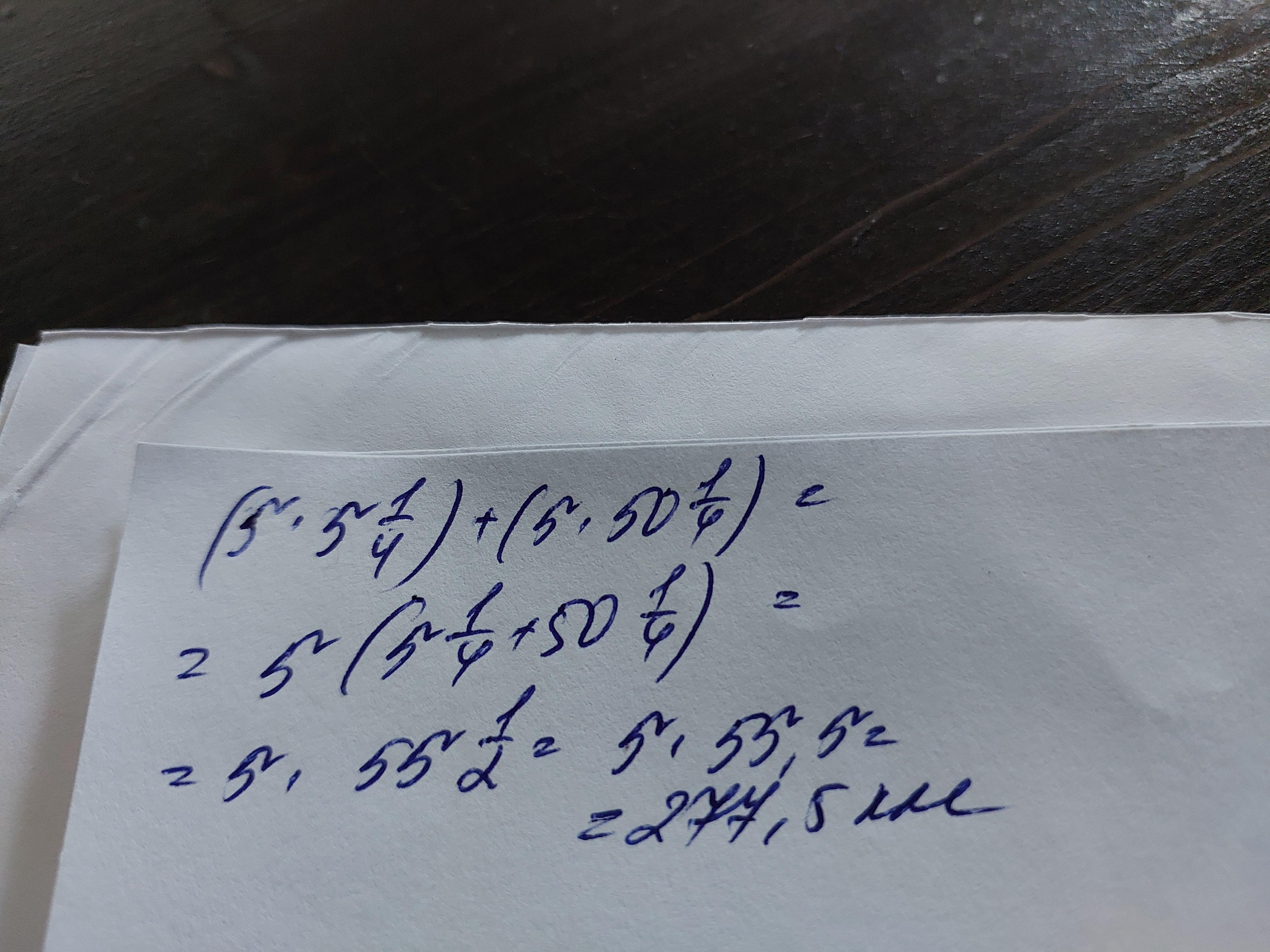 Поезд шёл 5часов со скоростью 50 1/4км в час и 5часов со скоростью 5 1/4 км в час.Сколько километров прошёл поезд за эти 10 часов