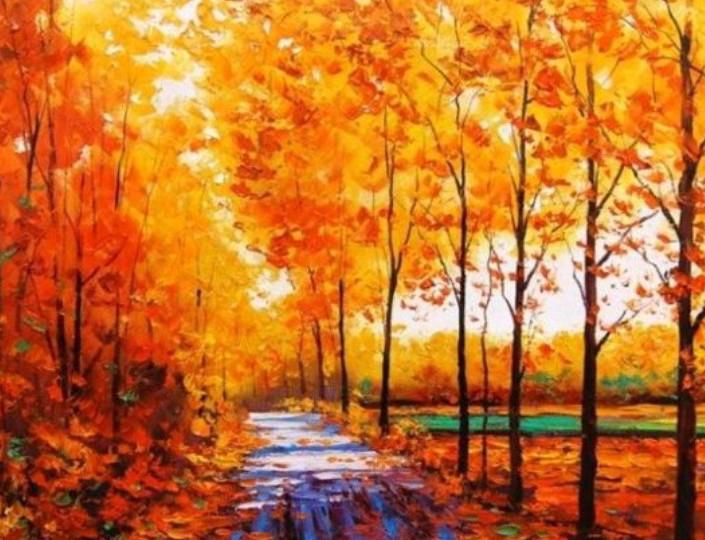 На задньому плані я бачу галявину на яку світить сонце, дерева в помаранчевому листі, стежку . Живописець вдало по'єднав холодні та теплі кольори так що з них вийшла така картина.