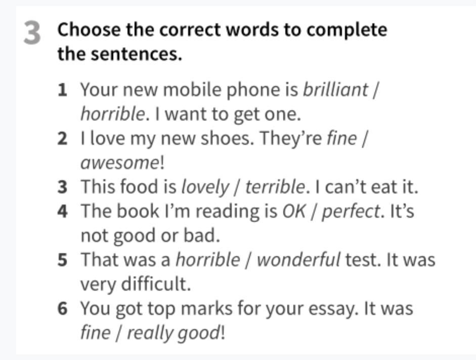 1 brilliant, 2 awesome, 3 terrible, 4 Ok, 5 horrible, 6 really good