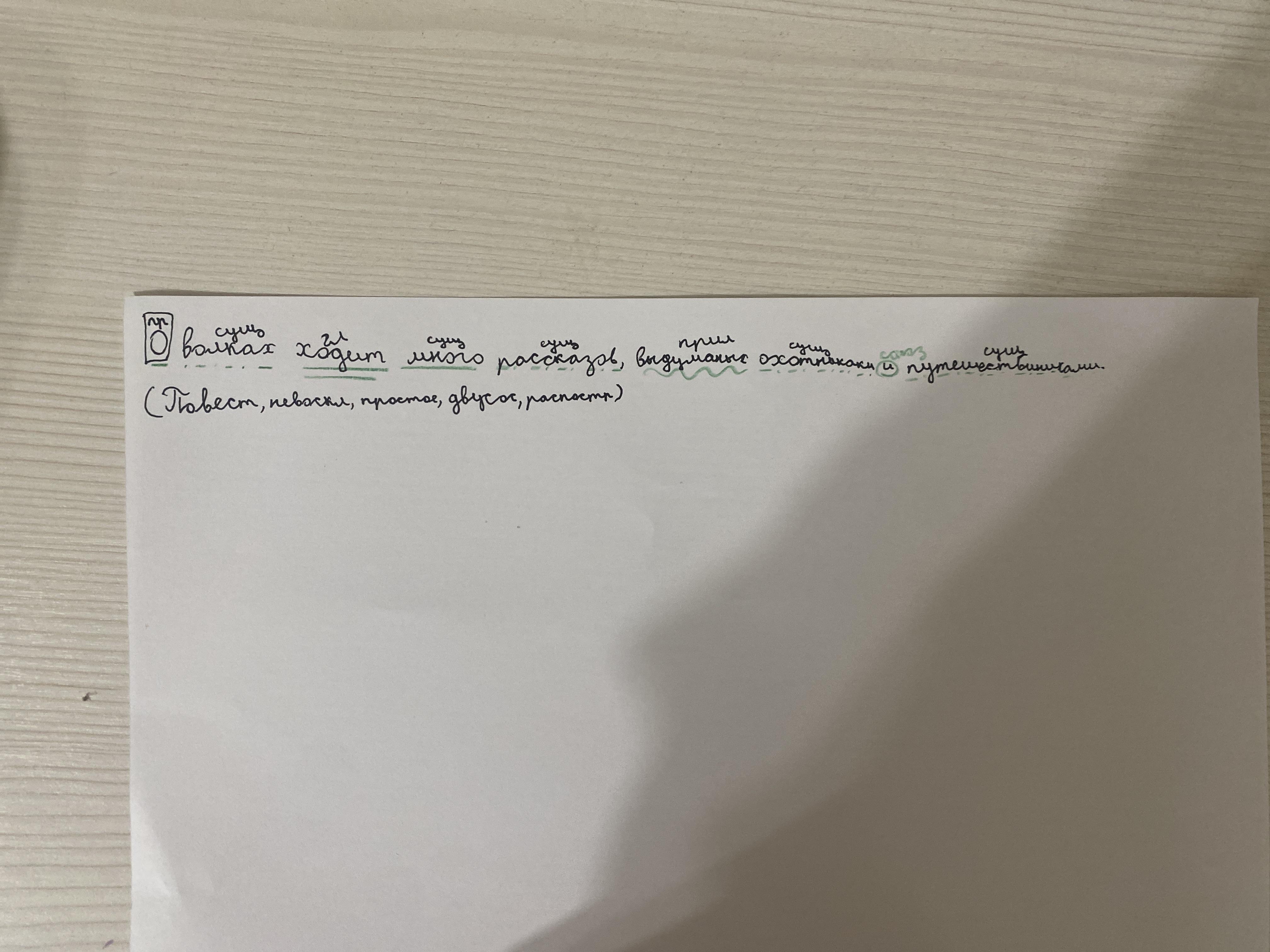 Предложение: "О волках ходит много рассказов, выдуманных охотниками и путешественниками."